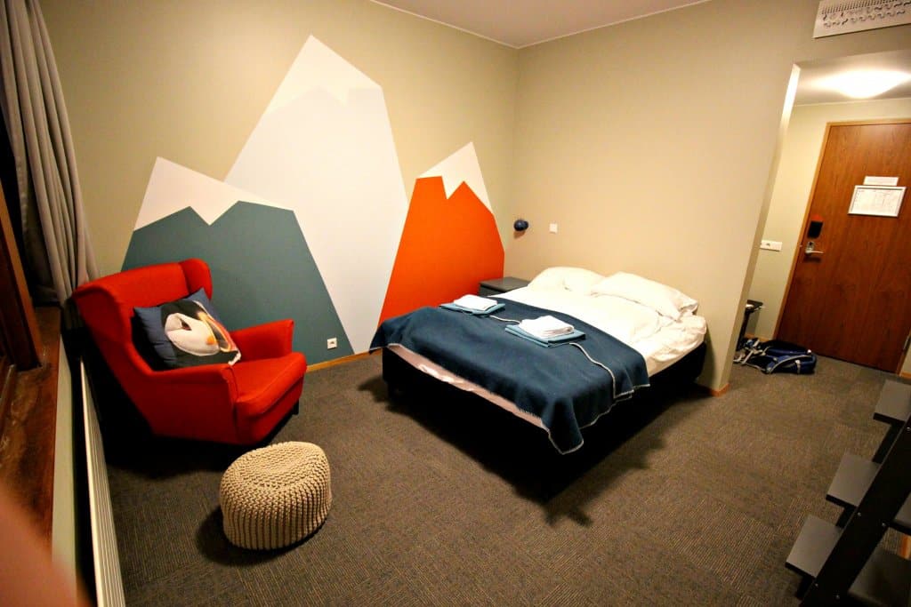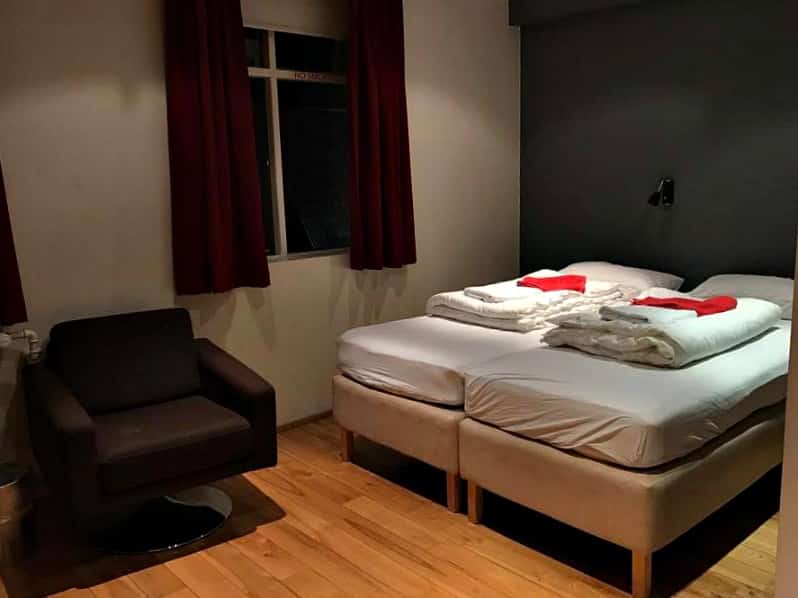 Algo engraçado é que as camas de casal na Islândia costumam ser formadas por duas de solteiro – veja as fotos. Gostei muito da staff atenciosa e também da limpeza e estrutura dos quartos. O banheiro (que ficava dentro do quarto) tinha secador, sabonete e shampoo. Tudo perfeito pra passar bem.