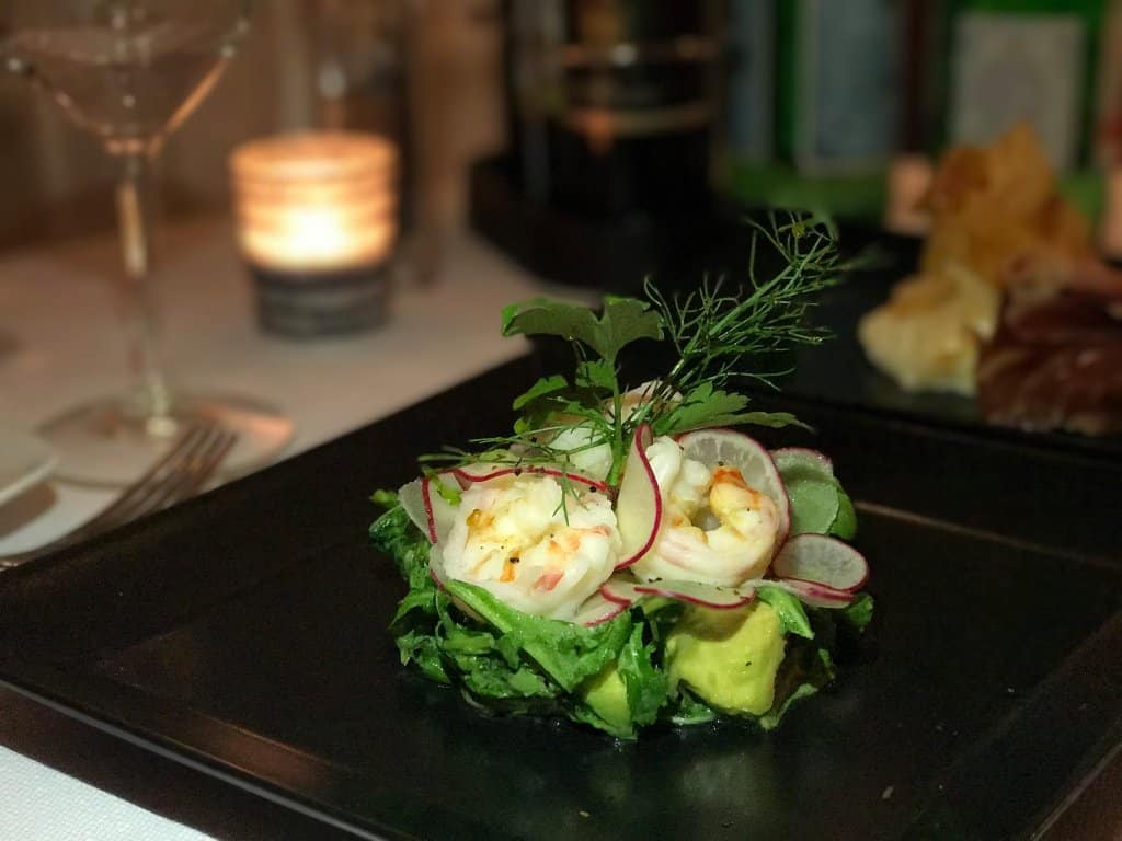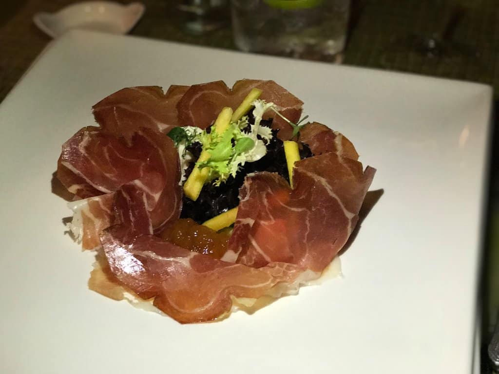 Começamos com uma salada de camarão, espinafre, rabanete, abacate e depois com a burrata (que parecia uma mozzarella e proschutto crocante. Os pratos demoram muito pra chegar (muito mesmo). Mas tudo bem, pois não tínhamos pressa.