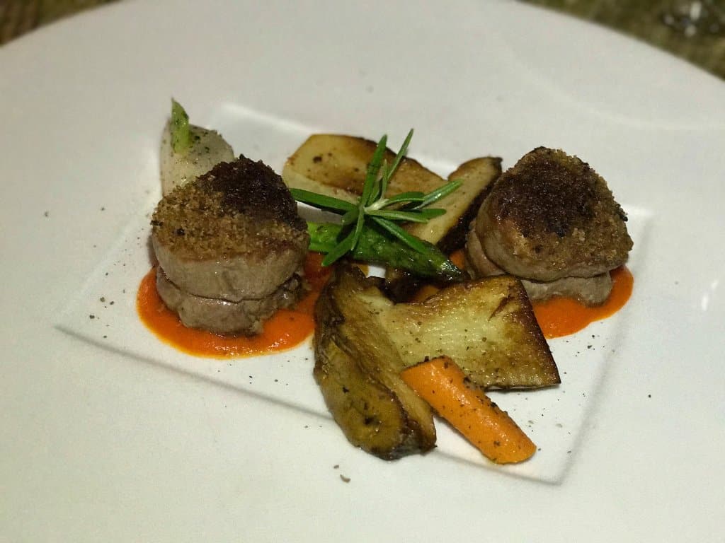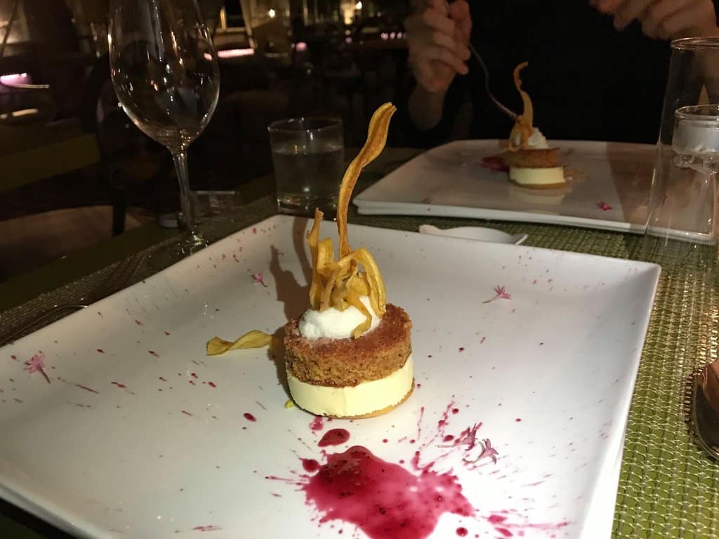 Assim que chegamos, enviaram uma entradinha que era um peixe com maionese de sabor estranho e confesso que não gostei. Mas a salada foi gostosa: presunto de parma, manga, ricota e geleia de damasco. O melhor de tudo foi a segunda entrada: um mil folhas de ricota com manjericão delícia!