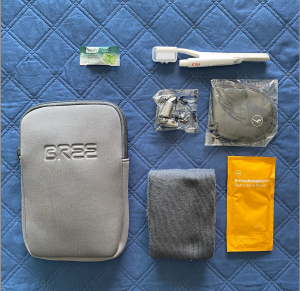 Tão logo me sentei, a tripulação já me trouxe o amenity kit do voo. Para um voo curto, achei bastante completo. Confesso que nem por este mimo esperava. Confira abaixo a foto: