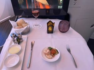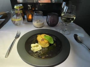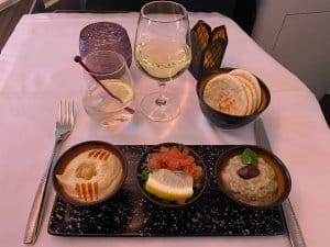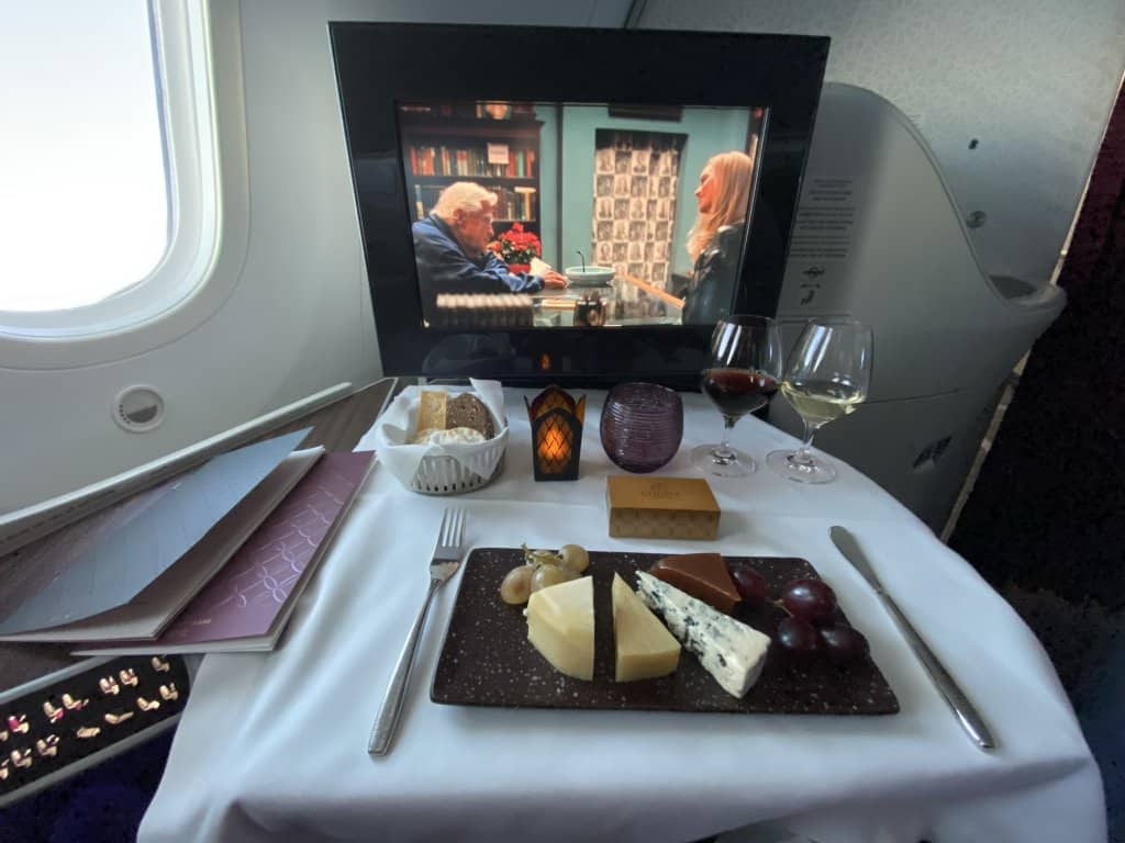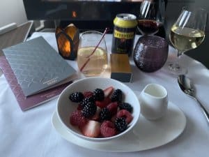 O jantar foi um momento maravilhoso. Em primeiro lugar a aeromoça vem preparar a sua mesa para servir. Em seguida você faz o seu pedido. O meu veio acompanhado de um bom vinho branco francês e um espumante rose. Tem até opções de pães sem glúten. Em terceiro lugar provei uma tábua de queijos acompanhado de um vinho tinto merlot. Por fim, a sobremesa era um bolo com calda de chocolate. Tudo lindo e delicioso.