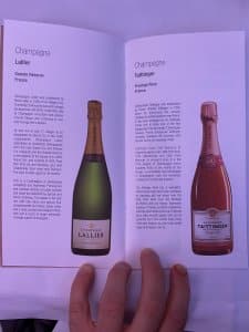 Logo que você chega, a aeromoça já se apresenta e te oferece uma taça de champanhe. Depois ela traz o menu de comida e o de vinhos para harmonizar. Menu de bebidas vem com informações e fotos da bebida, que fica mais fácil para harmonizar com a comida e ainda saber mais sobre seus ingredientes e o país de origem.