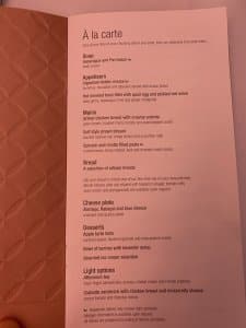 Logo que você chega, a aeromoça já se apresenta e te oferece uma taça de champanhe. Depois ela traz o menu de comida e o de vinhos para harmonizar. Menu de bebidas vem com informações e fotos da bebida, que fica mais fácil para harmonizar com a comida e ainda saber mais sobre seus ingredientes e o país de origem.