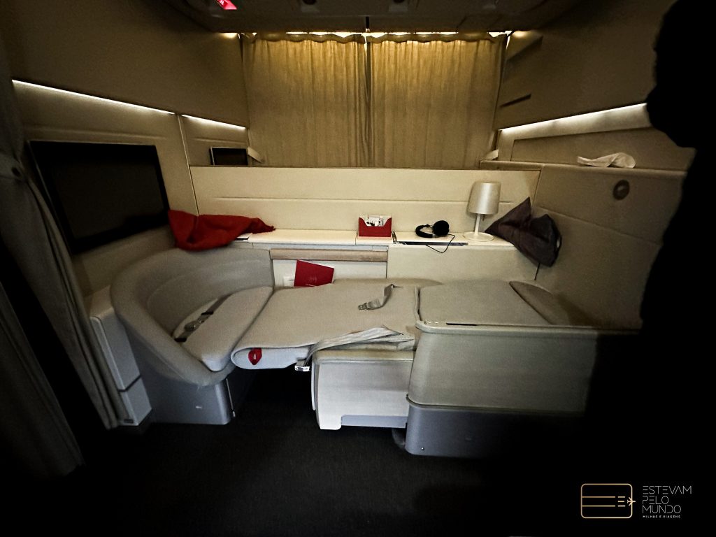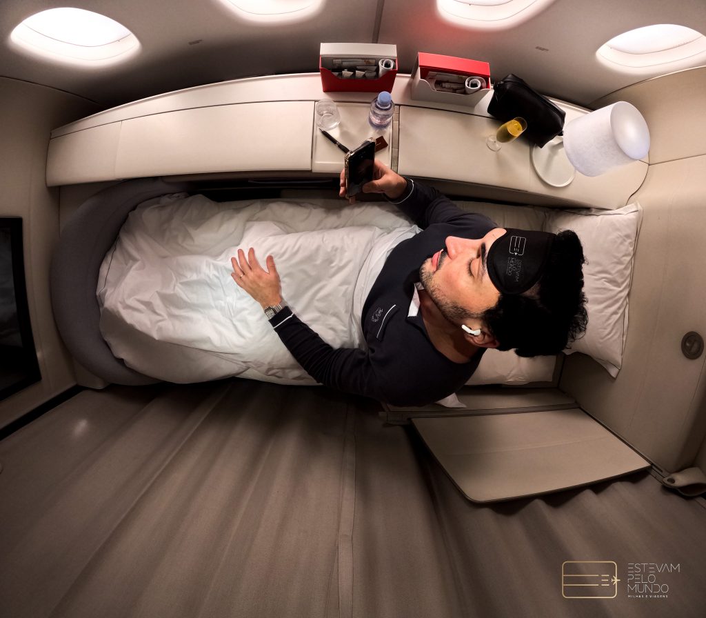 Tenho que confessar que foi uma das camas mais confortáveis a bordo que eu já experimentei na vida. A QSuíte da Qatar também fecha, mas ainda assim conseguimos ver quem está deitado nela. Aqui não, a cortina vem lá de cima e fecha tudo. Fica ótimo.