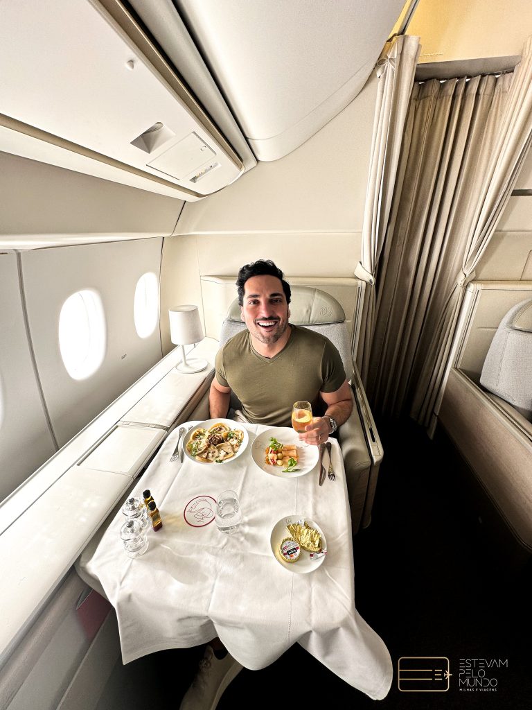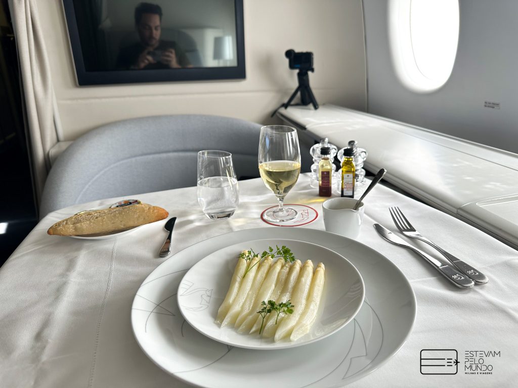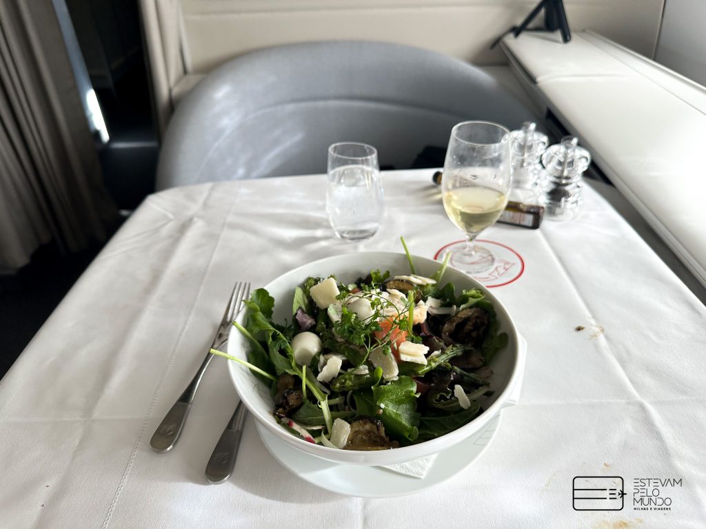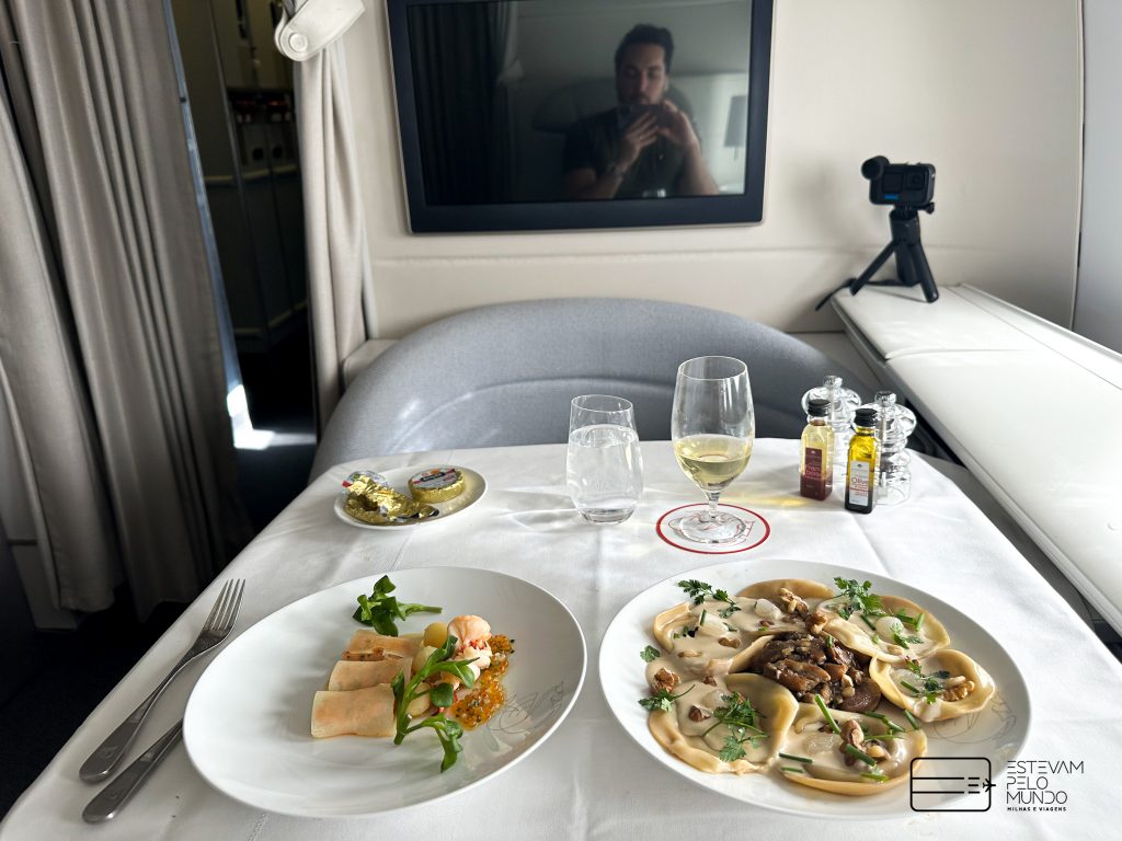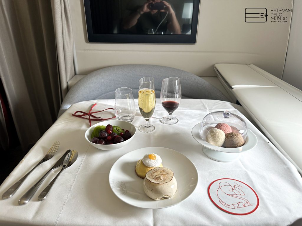 A mesa para as refeições é muito grande e como tem um assento na frente do meu assento, posso até jantar com alguém. O serviço foi super-rápido, a gente mal decolou e eles já começaram a arrumar a mesa e servir as comidinhas. Vale dizer que o menu é assinado por um chef Estrela Michelin.