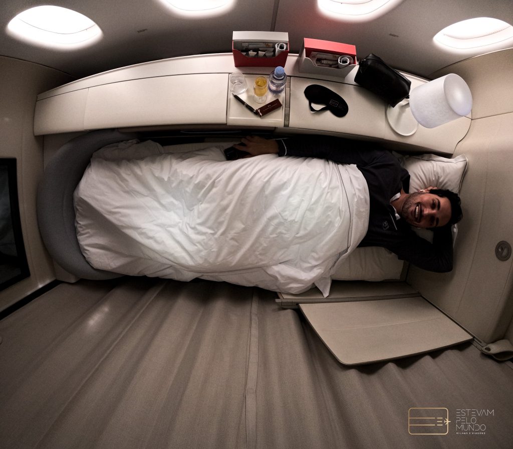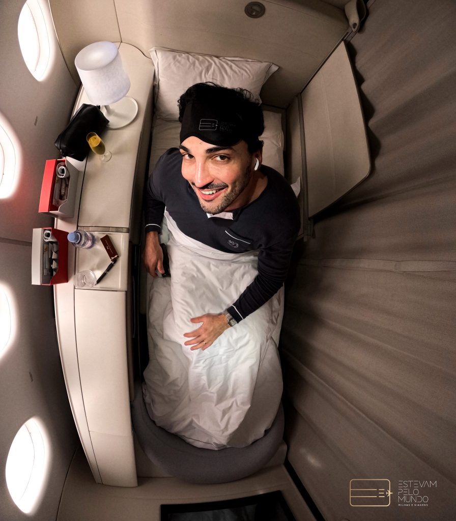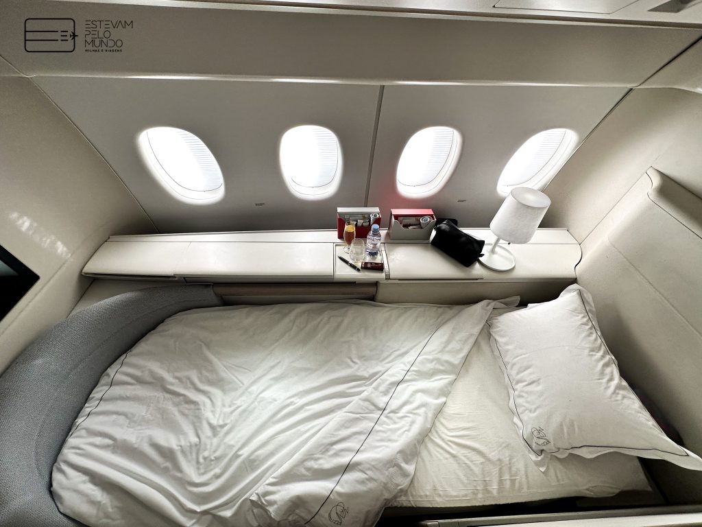 Esqueci de contar que esta cama tem 2 metros de comprimento e quase 60 centímetros de largura quando montada. É um belo espaço. Uma das maiores camas em aviões comerciais do mundo.