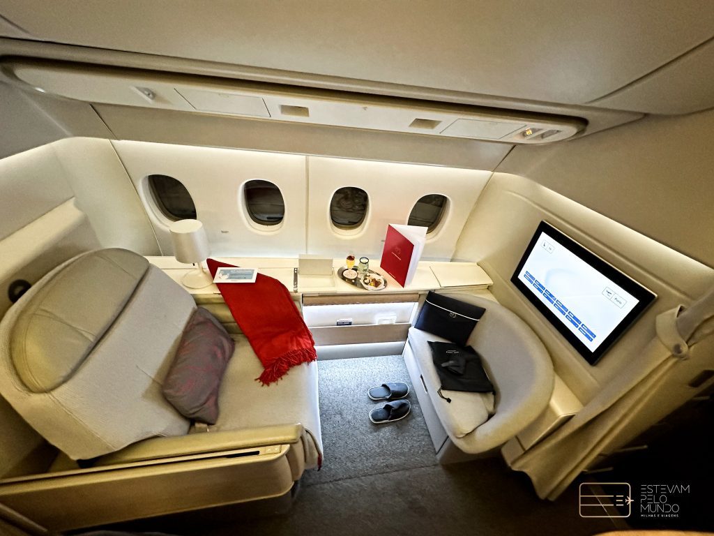 Eu quase não acreditei quando eu vi onde eu ia voar. Que luxo, Brasil! Este espaço La Première tem apenas quatro assentos. Super exclusivo. Eu tinha quatro janelas para apreciar a vista desse voo. A Emirates tinha três. Para você ter uma ideia do tamanho do espaço.