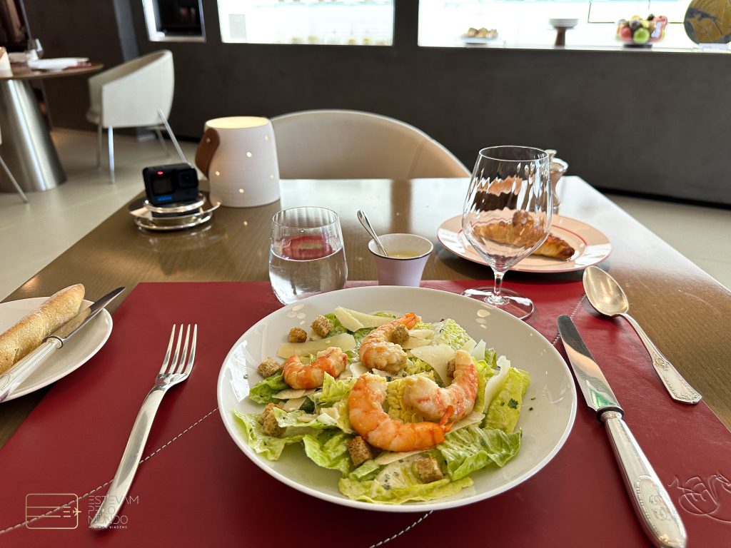 Você escolhe no menu o que quer comer e vem um garçom servir o seu prato. Muito Vip de verdade. Tomei meu café, dormi 4 horas, tomei um banho, fiz uma massagem e almocei. Foi tudo muito gostoso.