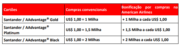 Vamos pegar como exemplo o cartão Santander AAdvantage® Gold, com compras convencionais (não realizadas na American Airlines) gerando 1 milha a cada 1 dólar gasto.