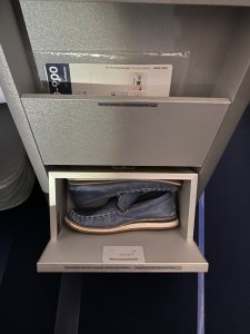 Pois bem, continuando a explorar o assento, junto ao descanso de pés há um compartimento ideal para guardar sapatos. Veja: