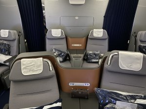 No que tange conforto, acho que a empresa peca um pouco no assento. Em uma aeronave moderna como o A350-900, recém-integrados à frota, acredito que já poderiam ter solicitado assentos mais modernos, onde todos os passageiros tivessem acesso ao corredor. A configuração 2-2-2 está, ao meu ver, bastante defasada para um produto business.