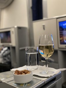 Tão logo tomei meu assento me ofereceram o menu do voo. O comissário que me atendeu naquela noite foi bastante profissional, embora bastante frio. Perguntou-me o que gostaria de drink de boas-vindas. Optei por champagne e água sem gás, trazidos em menos de dois ou três minutos junto com nuts.