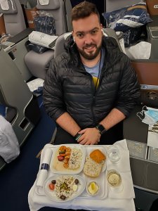 Por conta da pandemia, o catering está reduzido. Confesso que esperava mais. Em outubro passado, quando voei com a companhia-irmã Swiss, já em meio a pandemia, o serviço me pareceu bem mais completo. Não havia opção de queijo E doce. Era uma coisa OU outra. Igualmente, somente uma entrada foi franqueada por passageiro. Confira abaixo a foto do menu, bem como do jantar e do café da manhã.
