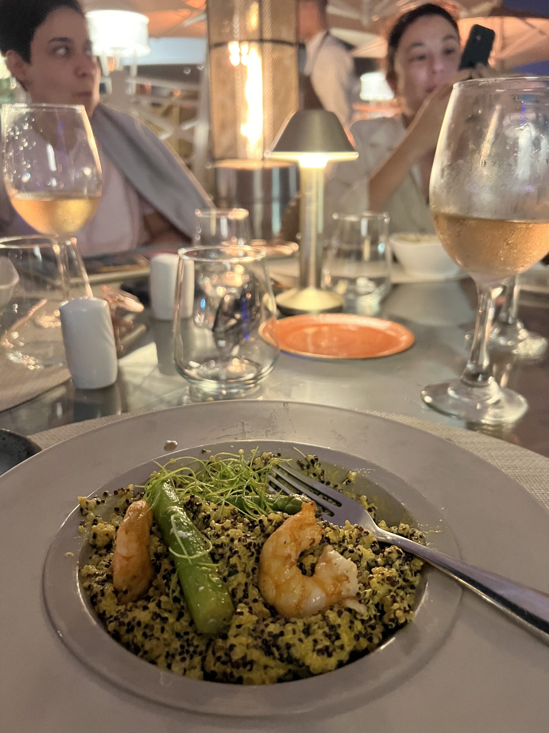 Para o pôr do sol, escolhemos ficar no Cornishe by Palmeraie, que é um complexo de três restaurantes incríveis, piscina e uma vista belíssima. Não é um lugar barato, mas vale a pena uma paradinha para um drink e ver o pôr do sol. Tem outros lugares como este também incríveis para aproveitar.