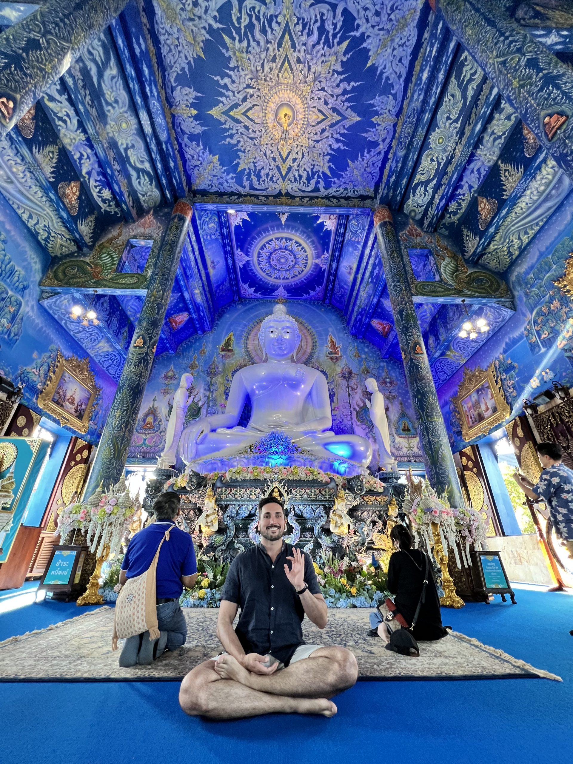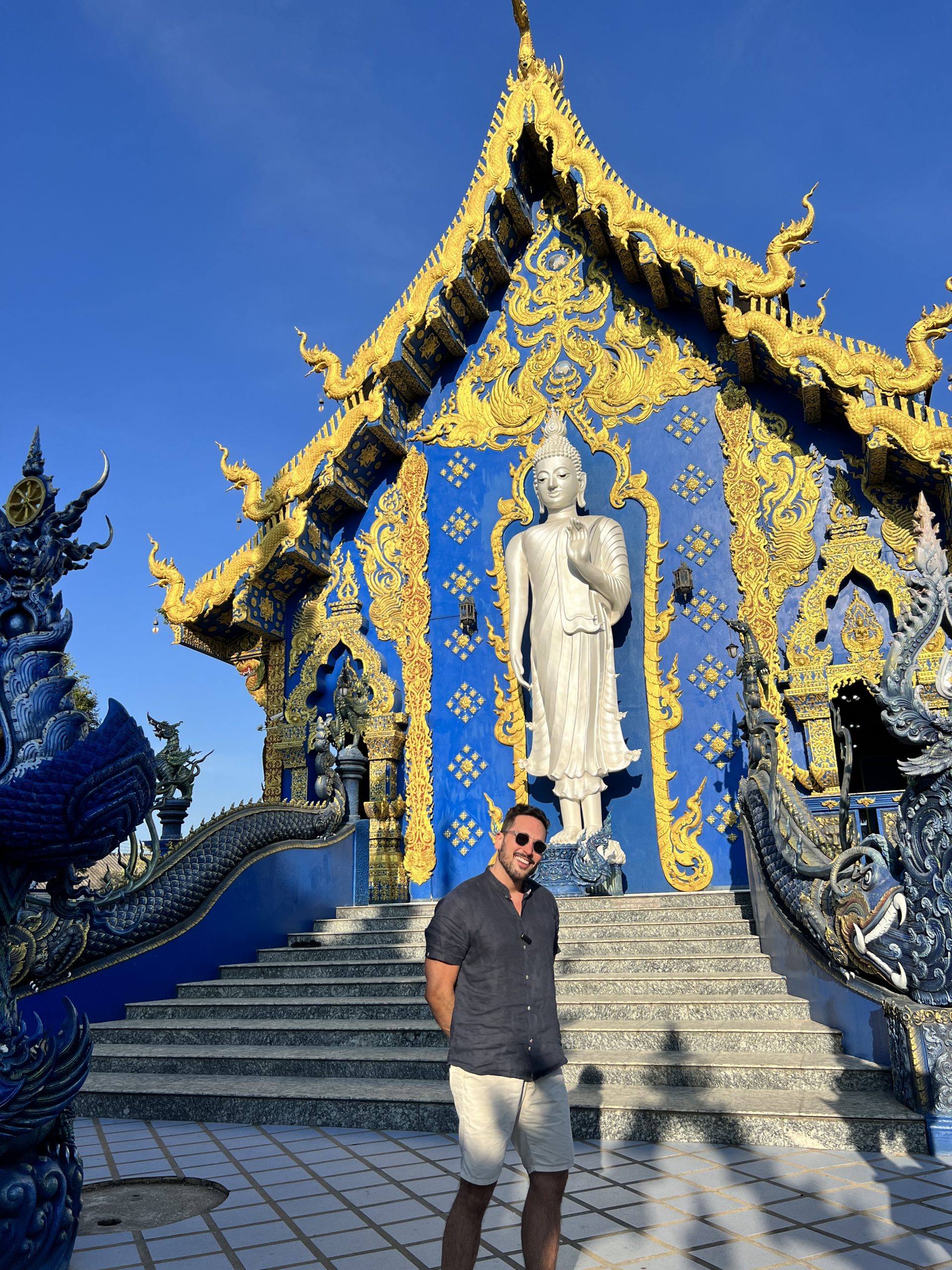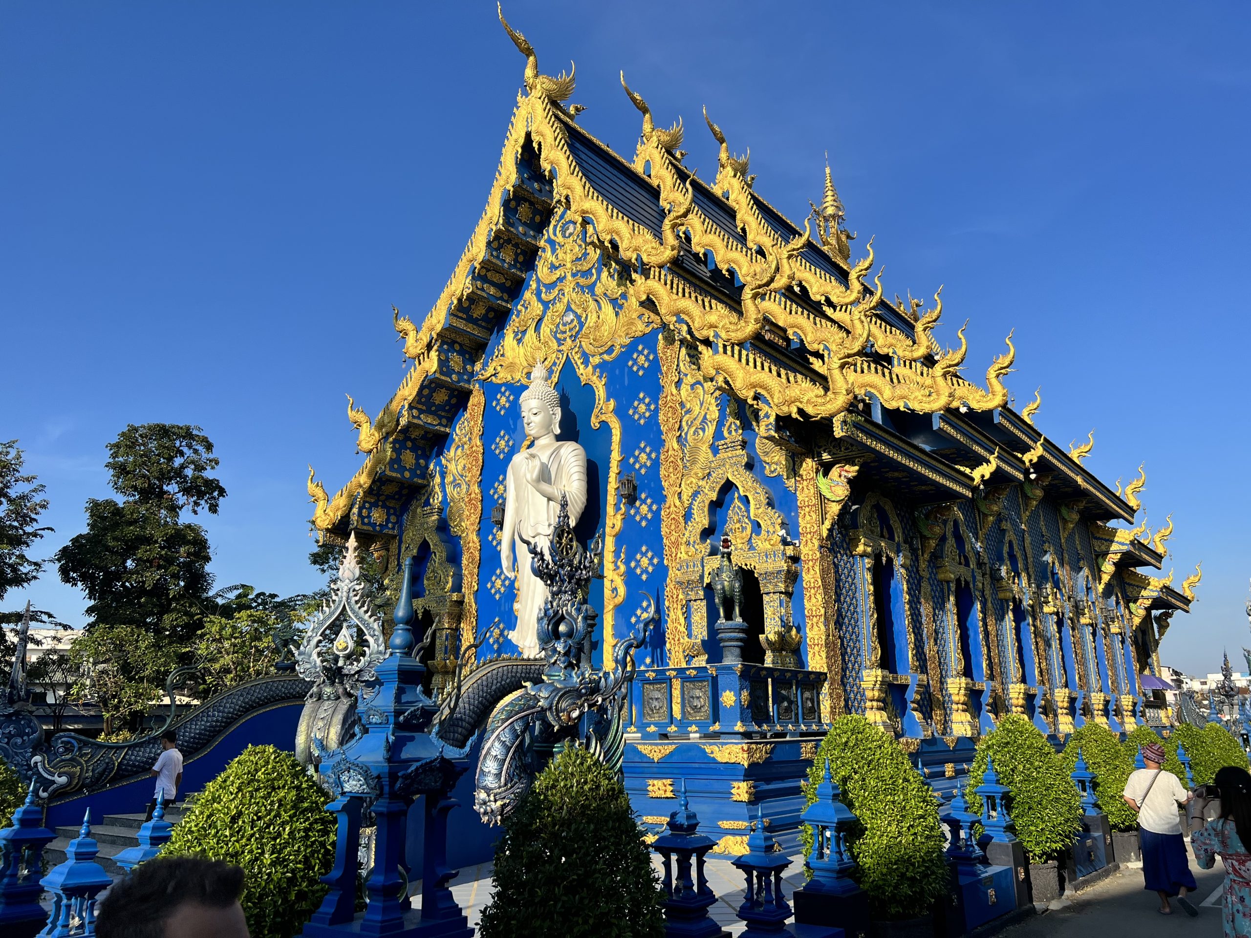 Conhecido como templo azul, foi construído em 2016. Ele é bem mais bonito por dentro do que o templo branco, que é mais bonito por fora. Na minha humilde opinião. Enquanto o branco do outro templo representa a pureza de Buda, o azul deste templo representa o céu e o dourado a riqueza.