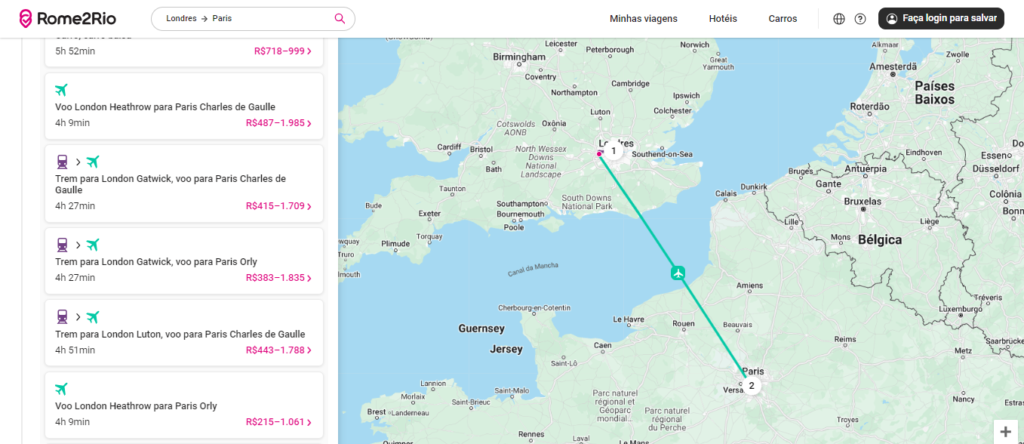 Ao pesquisar pelas opções, você será direcionado para uma página e resultados com todas as possibilidades, usando um ou mais transportes, para viajar entre as cidades buscadas. Nesse exemplo, vamos simular uma viagem de Londres a Paris.