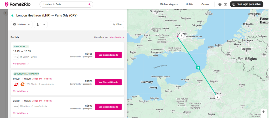 Agora, vamos supor que, para essa viagem, a opção mais cômoda seja um voo que saia do Aeroporto de Heathrow, em Londres, para o Orly, em Paris. Ao clicar nessa opção na lista de resultados, ele abre os detalhes onde você pode colocar a data da viagem (incluindo se é um voo apenas ida ou ida e volta), quantidade de passageiros e a possibilidade de filtrar por tempo de deslocamento, preço, horário de partida ou numero de conexões.