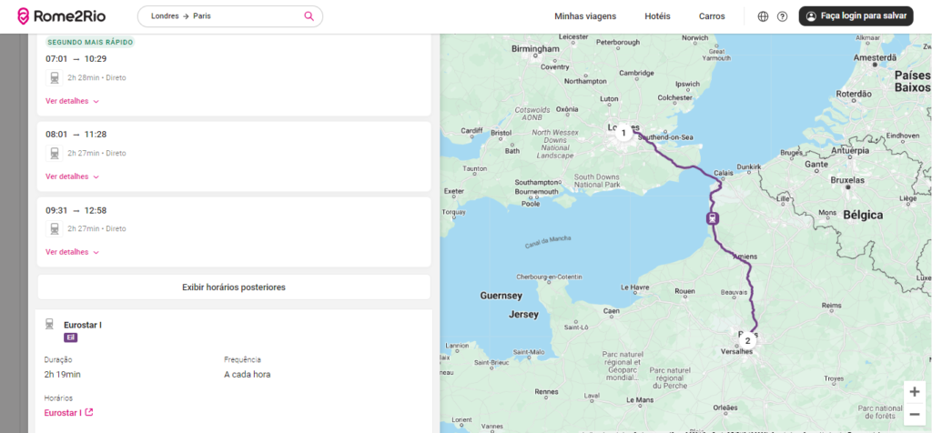 Simulando a viagem de Londes a Paris por trem, que foi oferecida pelo Rome2Rio como a opção de melhor custo-benefício, vemos que a plataforma indica o próprio site da Eurostar, a operadora do trem subaquático que atravessa o Canal da Mancha.