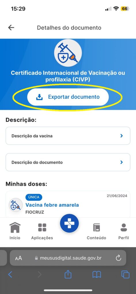 Selecione a vacina de Febre Amarela e clique em “Exportar documento”.