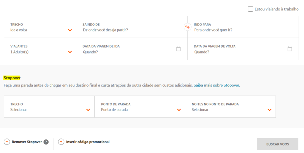 Ao abrir a aba de pesquisa de passagens na GOL, note que no canto inferior esquerdo há um botão “Adicionar stopover“.