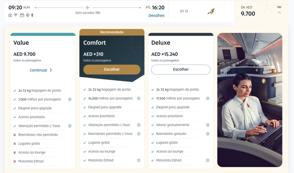 Agora com o exemplo da Etihad, a passagem em Executiva na tarifa Value é a possui condições limitadas: