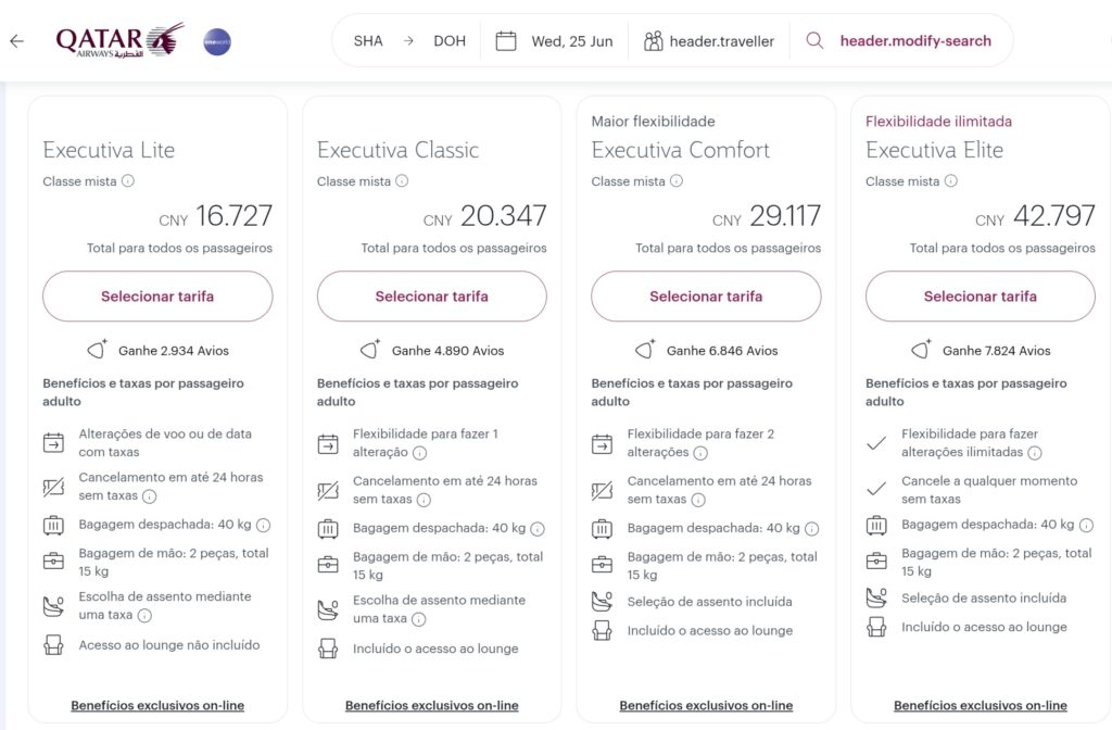 Na Qatar, a passagem em Executiva com menos vantagens está na categoria Lite. Veja que, na descrição do exemplo abaixo, a empresa informa que comprando essa tarifa: