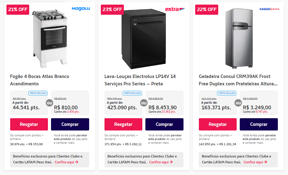 • Programas de recompensas de bancos e seus cartões associados – desde que tenham parceria com o Latam Pass;
