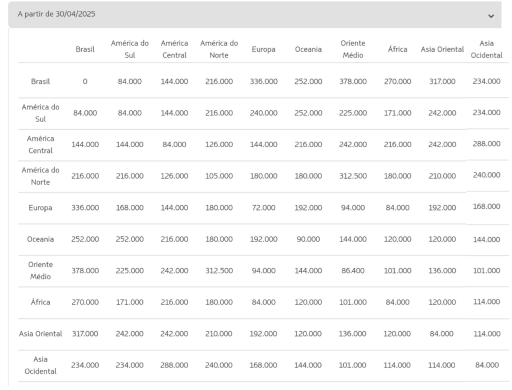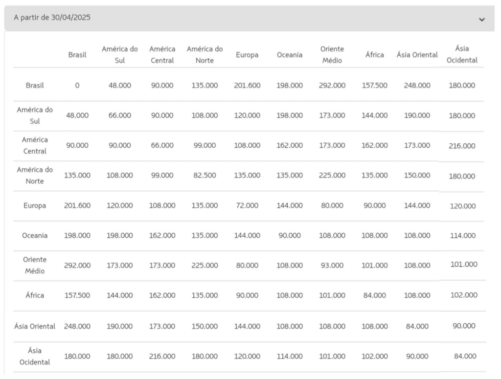 Para saber qual será o custo final de resgate da sua viagem em tabela fixa, a conta deverá ser feita com base entre as regiões que você vai voar e o número de conexões.